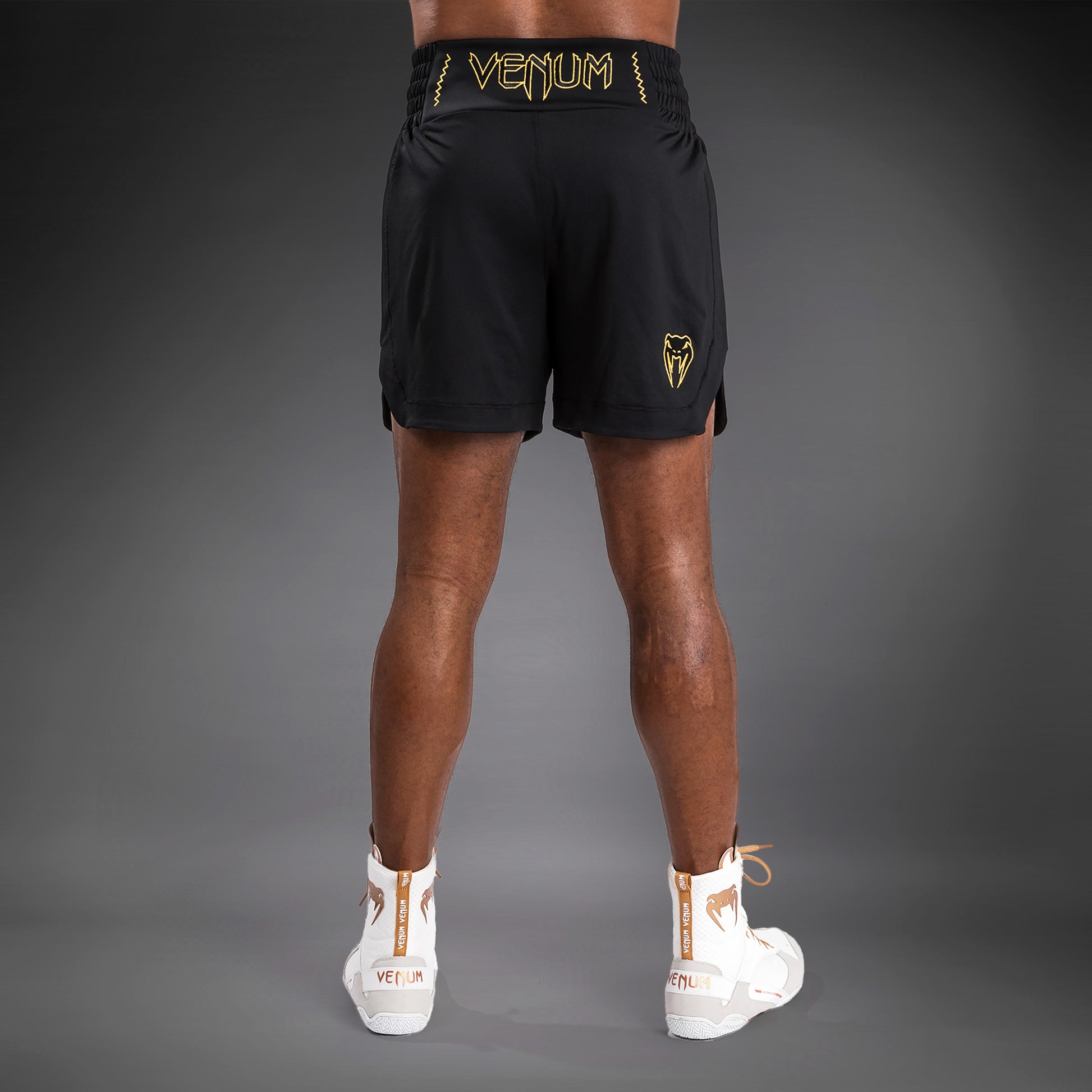 Embroidered Venum logos feature in gold at the front and back of the waistband and the left thigh.